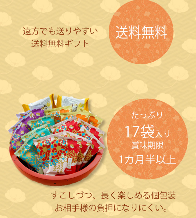 | 17袋入りのギフト用お詰合せを、送料無料でお届けできる大変お得な商品となっております。